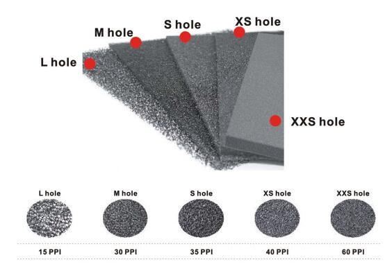 (Polyether and polyester) aperture (15ppi-60ppi), color (black, yellow, green, etc.), hardness and size of the filter sponge.