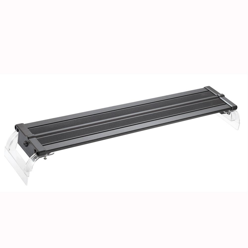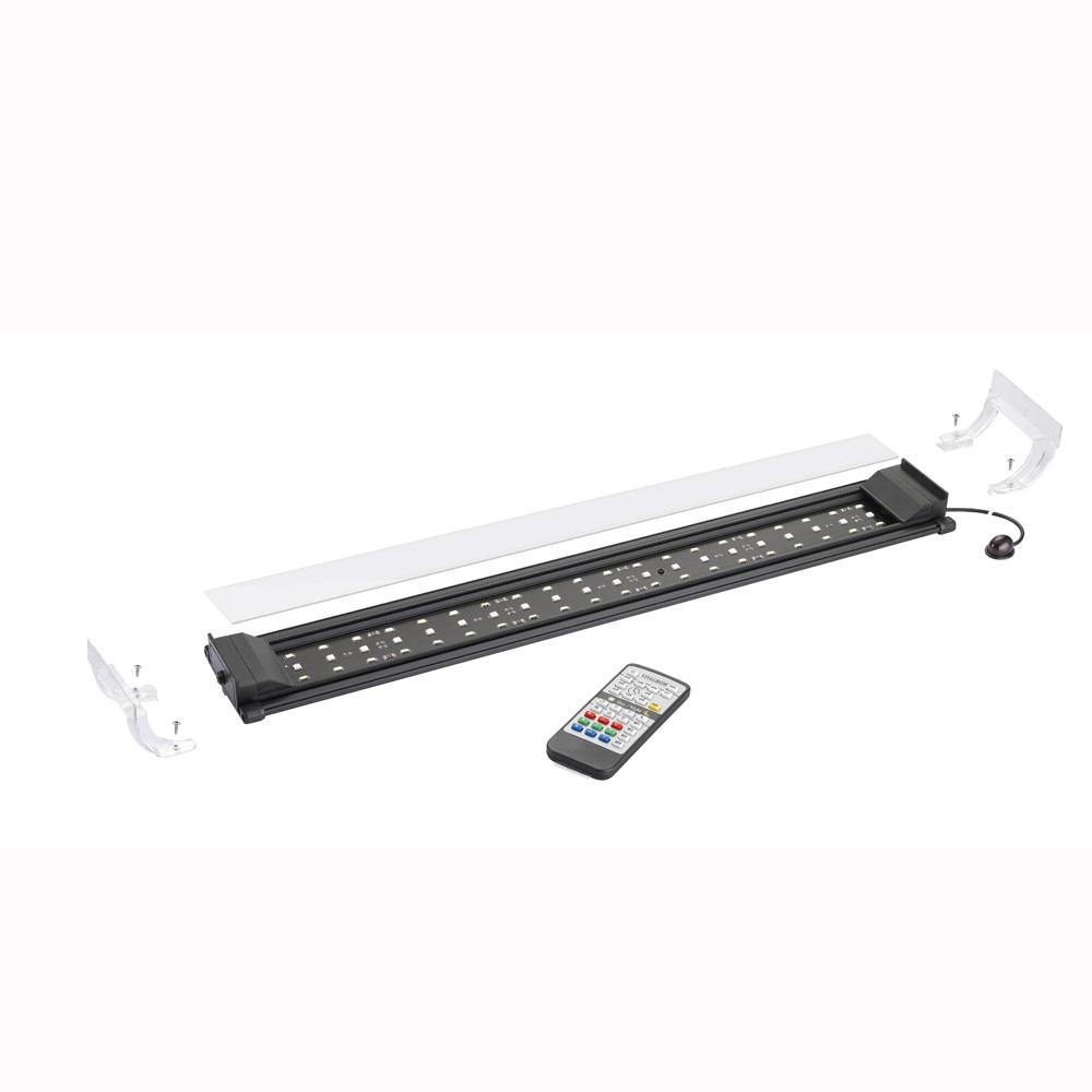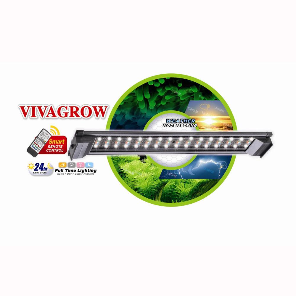 The VivaGrow DN series is a full automated LED aquarium light strip designed for any freshwater planted setups. The automated 24 hour cycle simulates any typical day starting from dawn, morning, high noon, sunset, and night time. Four pre-set weather modes are programmed and can be accessed by each button on the remote. (cloudy, thunderstorm, sunny, and moonlight). This fixture is also designed to allow the user to customize the intensity of each color from white, red, green, and blue. Up to four settings can be programmed and set for future use. Each unit includes an IR remote, power supply, splash guard, and brackets.